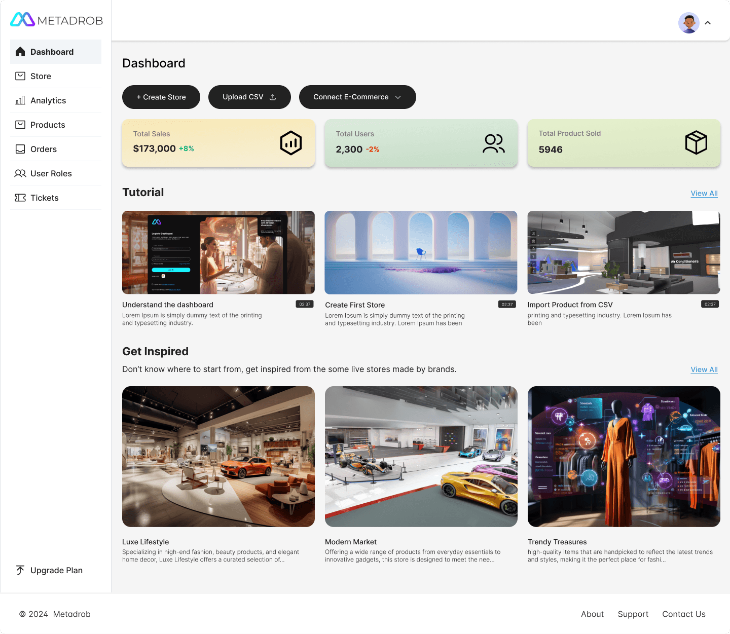 Improved Visual Hierarchy: Emphasis on most-used actions (Create Store, Upload CSV, Connect E-Commerce)