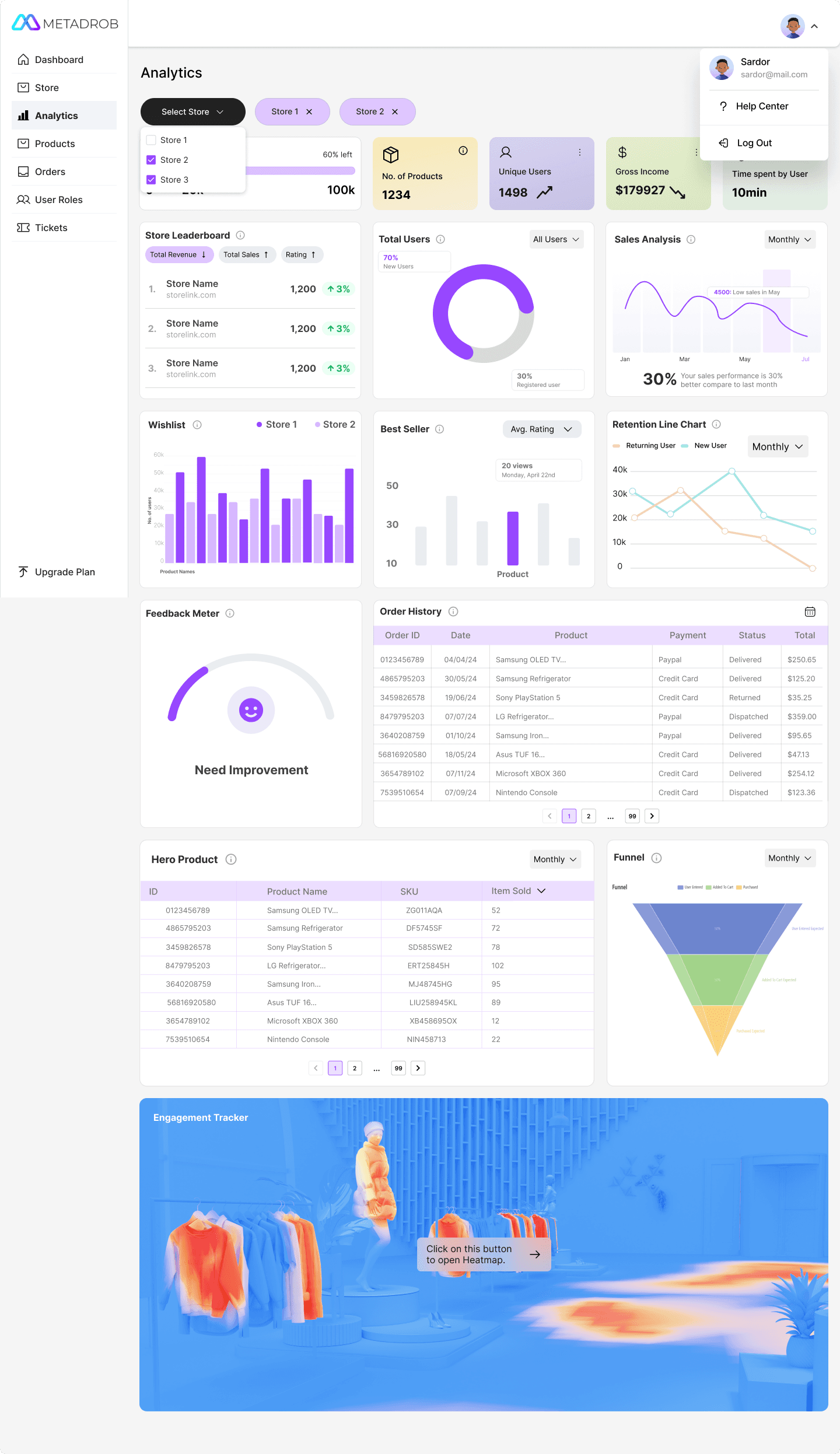 Modular Layout: Created a grid-based layout for modular components like Order History, Wishlist Trends, Feedback Meter, and Funnel analysis.